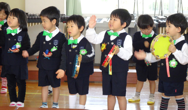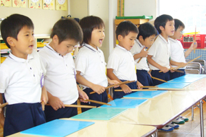 education policy(こころ) 2024.10.13 こころ 当学園の音楽教育につきましては、当学園の教育理念である「しせい教育」の下、「幼児期にふさわしい活動内容」として、「歌」「リトミック」「楽器遊び」を通して、音楽の楽しさを感じることを基盤とし、音楽の基本を身につけ、豊かな情操を養う活動に取り組んでいます。 幼児期における音楽活動では、日常の活動とその延長上にある行事(音楽会 等)を通して、自分なりに表現する楽しさを感じ、友だちと一緒に考え工夫しながら行う過程の中で、自己表現する素晴らしさ・みんなで力を合わせる素晴らしさ・やり遂げる達成感を味わって欲しいと願っております。 子どもたちに音楽の楽しさを伝えるためには、何より教師自身が音楽を愛し、技術、感性を習得する努力を日々積み重ねなければなりません。 バチ遊び 音楽会 造形・絵画・製作 当学園の造形・絵画活動は、教育理念である「しせい教育」の下、造形・絵画活動を表現活動の一つとしてとらえ、活動を通して、表現することの楽しさや自己実現することの喜びを感じて欲しいと願い取り組んでおります。 造形・絵画活動を、「幼児期にふさわしい方法で」、また、「幼児期にふさわしい順序で」行うために、教師は道具・画材・素材の「特性」「使い方」「スキルアップの順序・発展的な使い方」を熟知し、それぞれのポイントを的確に押さえて子どもたちに伝えていくことが大切です。 そして、子どもたちが道具・画材・素材の特徴を知り、扱いに慣れていくためにはどのような題材が適しているのか、また、子どもたちが感じたこと、考えたこと、イメージしたことを素直に自己表現していくにはどのような題材が相応しいのかを入念に検討していく必要があります。 子どもたちの表現の幅が広がることで、子どもたちは自分の伝えたいイメージを表すには、どんな道具・画材・素材が相応しいか考え、選択し、決定し、活動していきます。試行錯誤を繰り返しながら自分の思いが形になったとき、そして他の人に思いが伝わった時、子どもたちは「表現することの楽しさ」「自己実現する喜び」を心から感じてくれます。 園での造形・描画活動の一端を育てのパートナーとしての保護者の皆さまにもお知らせすることで、「子どもたちが自分なりに表現した楽しさや、友だちと一緒に協力してつくる喜び」を、教師と共に受け止めて頂き、子どもたちの更なる意欲を高めていきましょう。 お面づくり 何ができるかな?